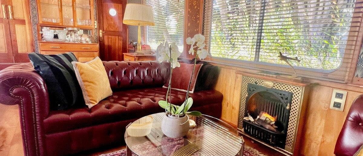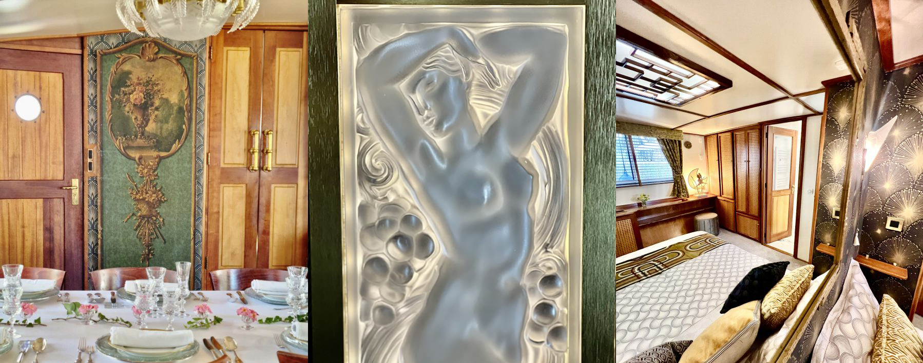 Elegance is a stunning luxury barge, with a sophisticated interior inspired by the Orient-Express. Matthia Gilles, the owner of the beautiful “Esperance“, has used his long-time passion for the glamourous train travel of the past as his inspiration for the stunning decoration; French craftsman René Lalique’s famous 1928 glass panels, rich woods and marquetry, beautiful Art deco wallpapers and many more handpicked items. With its huge picture windows, Elegance is a gem of coziness and brightness. The ceiling height is an exceptional at 218 cm!