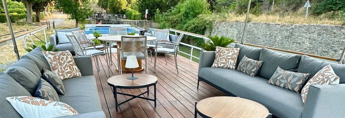 Lots of comfortable outdoor seating on the specious and sun-filled deck (which also boasts a large jacuzzi) lends itself to al fresco dining and relaxing hours watching the stunning countryside of the Garonne float by. Matthias’s barges are known for their wonderful cuisine which highlights the flavours of southern France; delectable seafood and meats, locally-grown crisp fresh vegetables and salads, accompanied by delicious local wines – along with stunning table settings that further delight the senses!